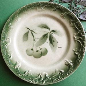 商品紹介: さくらんぼをステンシルで描いた絵とお皿の周りのレリーフが美しい落ち着いたグリーンカラーのアンティークのお皿です。