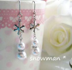 商品紹介: ホワイトパールで可愛い雪だるまをデザインしました。冬のマストアイテム、雪の結晶をプラスして素敵なロングピアスが出来上がりました。長さ(ピアス金具抜きで)約32mm、パール6、8mm大