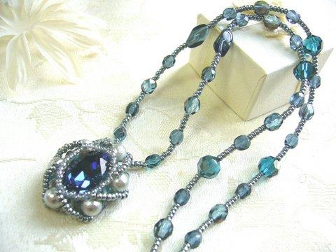 トップモチーフはスワロフスキーの周りに落ち着いた色合いのシュガーパールで囲み込み、シードビーズやチェコガラスビーズでらせん状に装飾を施した繊細でエレガントな仕上がりです