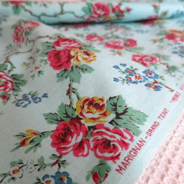 商品紹介: 中厚でさらりとしたしなやかな手触りのプリントファブリック。 ミントブルー地に優美なバラや小花のブロッサム模様です。フランス製。