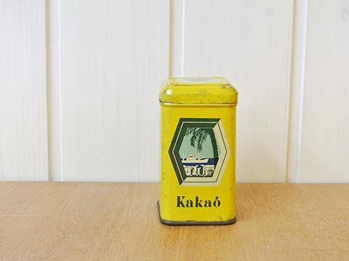 黄色いストライプ柄に、カカオを積み出す船の絵が描かれた可愛らしい小さなココアの缶です。フタの開閉は少し固めです。