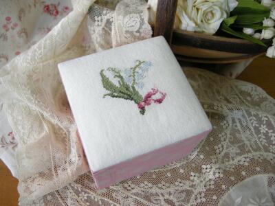 商品紹介: ベルギーホワイトリネンにすずらんのデザイン刺繍を施し、ピンクのフランスマドヴァンのモチーフプリント生地を使用してカルトナージュ調に仕上げています。ジュエリーボックスにしたり小物の収納をしたりとお役立てください。