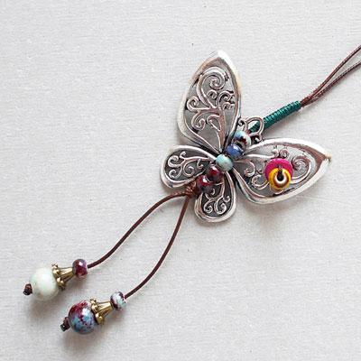 商品紹介: 蝶々のモチーフが印象的な、透かし彫りペンダントです。中央や下の部分に、”貴妃酔”と呼ばれるビーズがついています。蝶:縦4.5×横5.5×厚さ1cm、コード長さ:約80cm